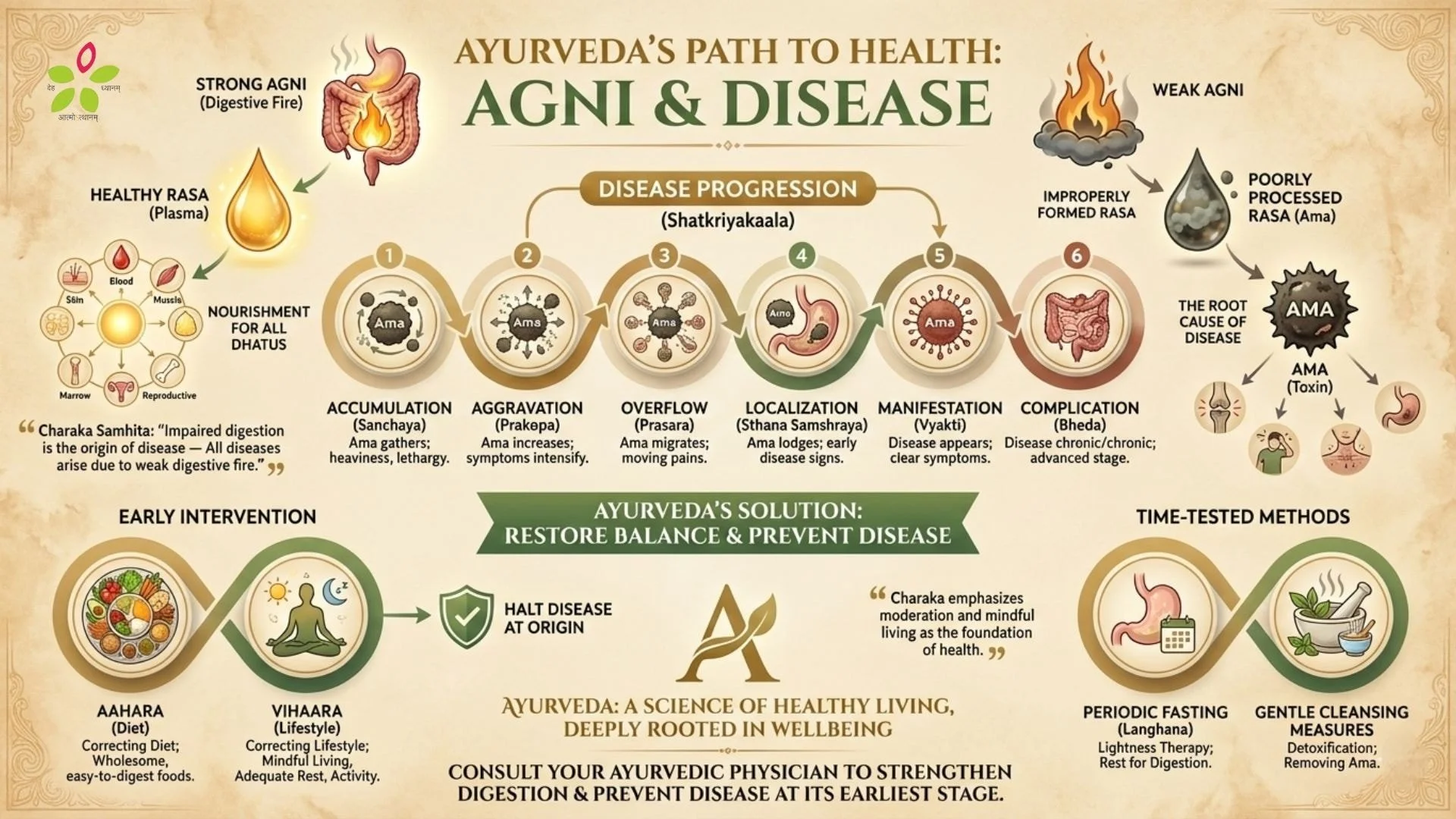 In Ayurveda, almost every imbalance can be traced back to Agni. Weak or imbalanced agni leads to Ama, undigested material, toxins, the sticky residue that clogs channels and creates dis-ease.